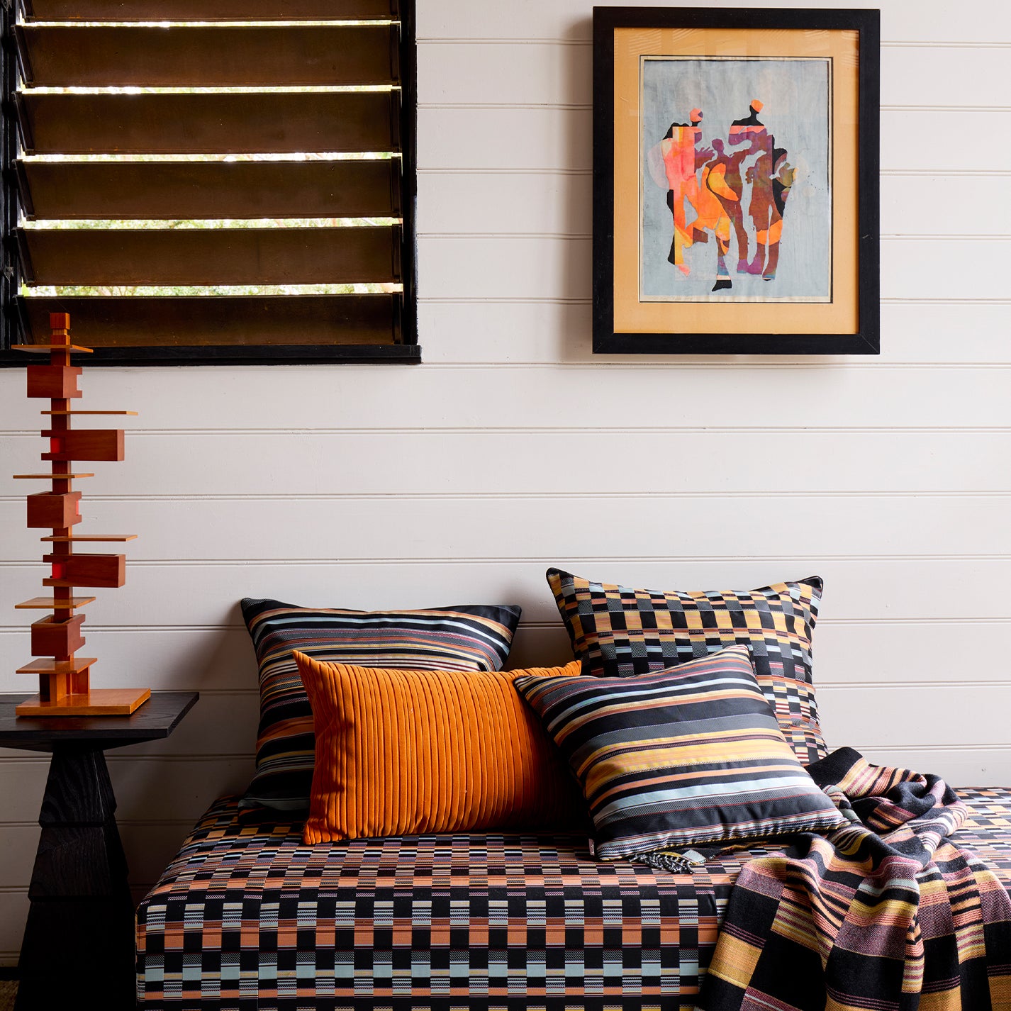 Our vast horizons are a never ending source of wonder as light plays with banded clouds, dust blown from a far off drought or distant mountain ranges. It is a daily dance of inspiration that plays out most strikingly as the sun sets. Horizon is a homage to that ritual. This double sided stripe jacquard weave captures two different moods depending on which side you choose to use.