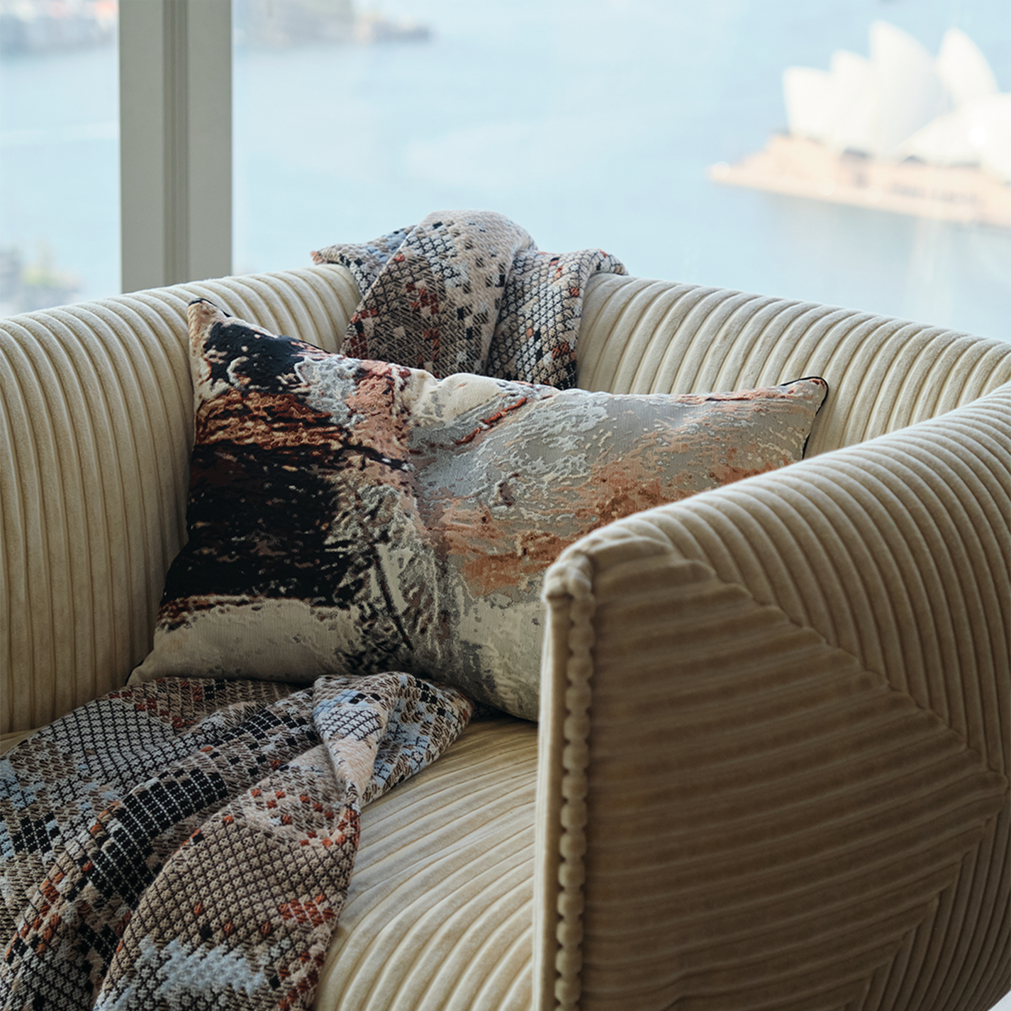 Our master weavers looked at the Territory design motif through the lens of the net-like pattern seen in our Banksia fabric. Moments is the wonderful result.